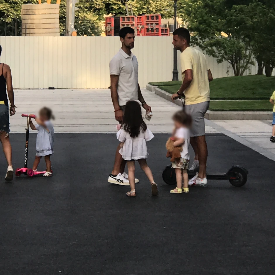 Paparaco našeg lista uslikao je Novaka u trenutku dok je sa rođakom brinuo o mališanima dok je njegova supruga Jelena bila zauzeta seminarima i predavanjima. Kako je pre podne završio obaveze koje se tiču treninga, on je sačekao da temperatura postane prijatna kako bi sina i ćerku izveo napolje.