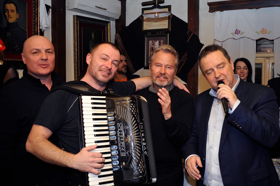 Oskarovac, koji se proslavio ulogama Stivena Puškova u "Lovcu na jelene" i Kloda Bukovskog u "Kosi", nije seo za sto ni kada se završio Dačićev mini-koncert. Naprotiv, brzo se uklopio i u ritam narodnjaka, ponavljajući da je "muzika fenomenalna, ista kao, na primer, u Teksasu".