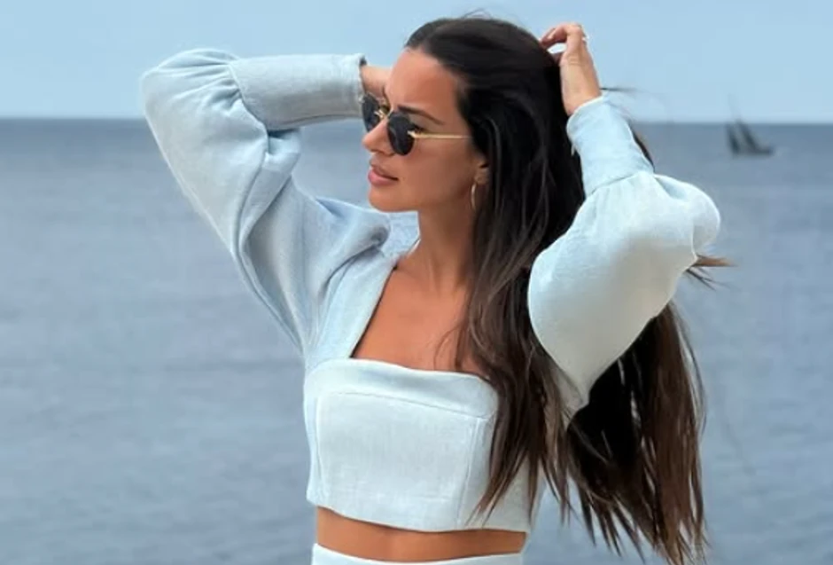 Naime, voditeljka je pozirala u svetlo plavom kompletu - topu sa dugačkim rukavima koji je otkrivao njen stomak, i šortsu istog dezena koji je savršeno istakao njene noge kao i taman ten.