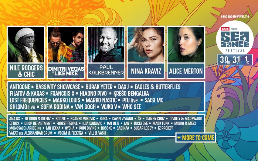 prve balkanske hip-hop izdavačke kuće Bassivity, sa misijom da predstave neke od novih zvezda regionalne rep scene. Tako će, pored ultra popularnih imena kao što su VIP i Coby, na glavnoj festivalskoj bini pokazati šta znaju Arafat, Surreal, Fox, Kukus Klan, Arafat, Mili i Sara Jo. Svoje nastupe na petom jubilarnom izdanju Sea Dance festivala koji će biti održan od četvrtka, 30. avgusta do subote, 1. septembra plaži Buljarica u Budvi potvrdili su Dimitri Vegas; Like Mike, Paul Kalkbrenner, Nile Rodgers ; Chic, Nina Kraviz, Alice Merton, Dax J, Lost Frequencies, Burak Yeter, Antigone, Francois X, Shlømo, Eagles Butterflies, Filatov;Karas, Sofia Rodina, Marko Nastić, PTU Live, Hladno pivo, Van Gogh, Marko Louis, Sajsi MC , Krešo Bengalka, Vojko V, Who See, Bassivity Showcase, Lag, Vakat AKA Aleksandar Grum, Forest People, Gillerz & Be Good, Ilija Đoković, Sugar Lobby, Monosaccharide, Bodzie, Popi Divine, Mr. Lekka, Branko Vuković, Buba, Vegim & Flekitza, Ana RS, TZ Project, ČX, Sabinaa, Jan De R i mnogi drugi. Trodnevne ulaznice za Sea Dance po ceni od svega 2.990 dinara dostupne su na sajtu seadancefestival.me samo do 22. avgusta, nakon čega će cena biti viša, a preko zvanične turističke agencije EXIT festivala EXIT Trip, u ponudi je i smeštaj i organizovan prevoz iz Srbije.