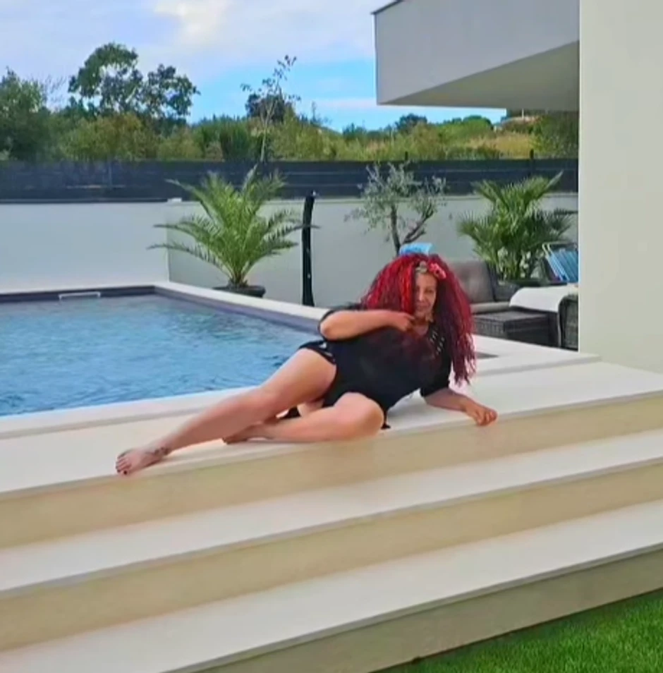 Folkerka Stoja Novaković (53) od nedavno je ofarbana u crveno, a sada je pozirala na stepenicama pored glamuroznog bazena koji ima u svojoj vili.