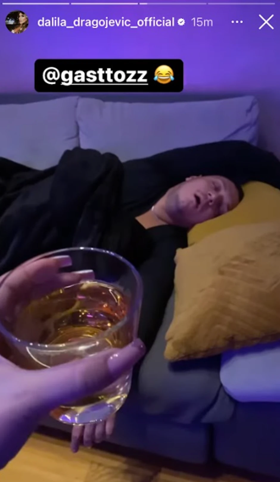 Domaćin se toliko napio, da je je u jednom momentu zaspao u dnevnoj sobi, a sve to je snimila Dalila i objavila na Instagramu.