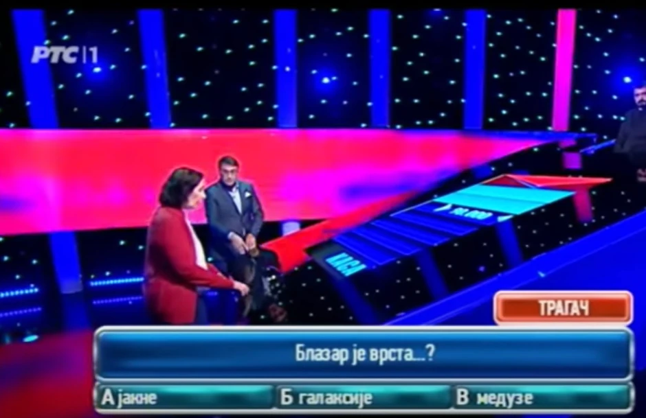 - Blazar je vrsta a) jakne; b) galaksije; v) meduze? - glasilo je pitanje na koje takmičarka po sopstvenom priznanju nije dala odgovor.