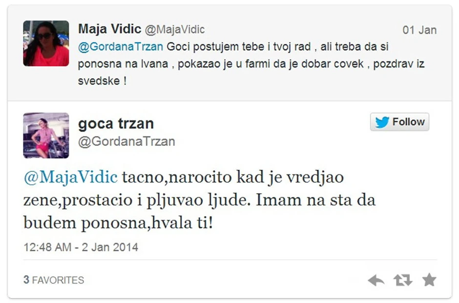 Odnos Goce Tržan i njenog bivšeg supruga Ivana Marinkovića pogoršao se nakon njegovog učešća u rijalitiju Farma. Sam Ivan otkrio je da mu je Goca poručila da je "u tom svinjcu mogao da ostane još 5 godina", a požalio se i na to što mu još uvek nije dozvolila da vidi njihovu zajedničku ćerku Lenu, od koje je Marinković bio odvojen čak četiri meseca.