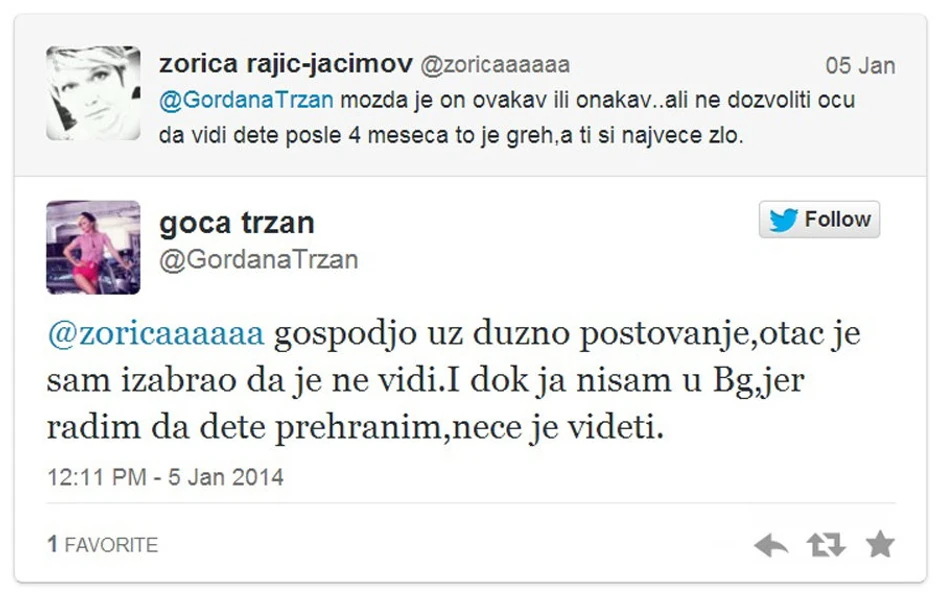 "Možda je on ovakav ili onakav, ali ne dozvoliti ocu da vidi dete posle 4 meseca, to je greh, a ti si najveće zlo", glasi jedan od komenara, na šta je Goca kategorički odgovorila: "Otac je sam izabrao da je ne vidi. I dok ja nisam u Beogradu, jer radim da dete prehranim, neće je ni videti!"