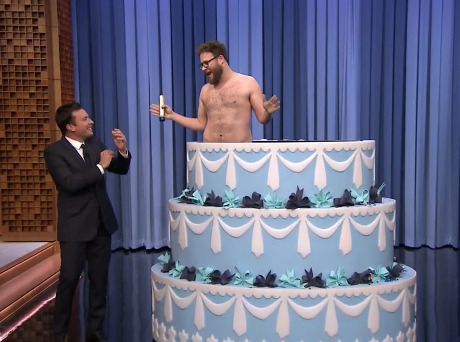 Ubrzo se na sceni našla i džinovska torta, iz koje su iskočili glumci Džejms Franko i Set Rogen, koji su do suza nasmejali voditelja ali i sve prisutne.
