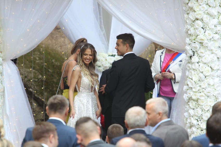 Par nije krio dobro raspoloženje, pa osmeh sa lica nisu skidali, dok su im zvanice aplaudirale nakon sklapanja bračne zajednice.