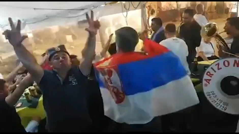 Jedan od ljudi na veselju takođe je ogrnut i srpskom zastavom, a društvo mu pravi nekoliko lepotica koje takođe nose šajkaču.