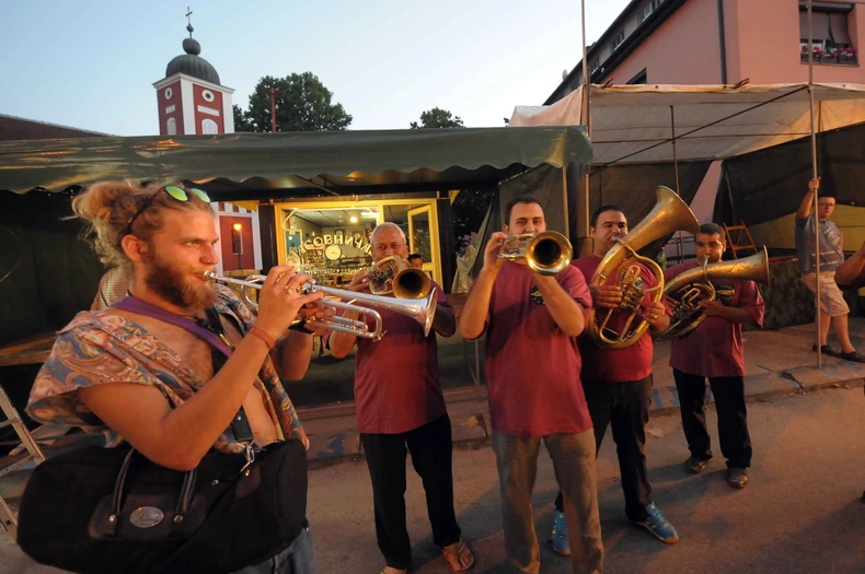 U centru Guče, na ulici trešti "Đurđevdan". Među tamnoputim trubačima iz Surdulice nalazi se i mladić izrazito bele puti, Izraelac Avi Sani.