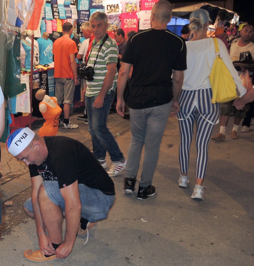 U Guči večeras opšte ludilo. Najveselije je kod spomenika trubaču gde se saboraši zabavljaju uz srpske ali i inostrane trubačke orkestre, a potpuno se ''otkinu'' kad neko od njih zasvira popularni Vrtlog. Onda svi skaču, bacaju se kao u transu, polivaju pivom, nazdravljaju domaćom rakijom. Nema tu naroda ni narodnosti, stranih jezika i nerazumevanja. Svi su ekipa i sjajno funkcionišu…