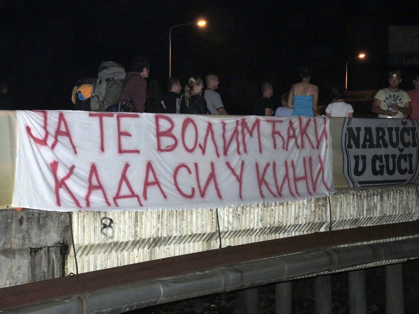 A grobari tužni zbog ispadanja iz evropskog takmičenja došli u Guču da ih trube ‘’dignu’’. Zaborave na tren pa počnu da pevaju i igraju a onda se izbedače i vrište kroz masu: "Joooj Trajkoviću, aaaauuuu…."