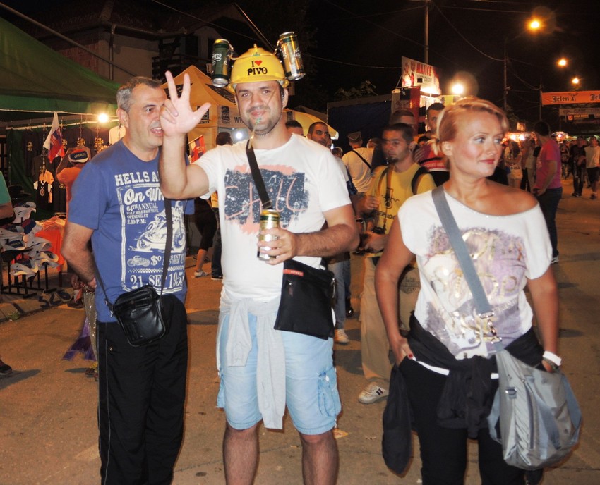 Nedaleko od centra drugačija slika, i žena i pivo. U setnji sa pripadnicom nežnijeg pola, muškarac sa kacigom piva na glavi. Spojio lepo i korisno.