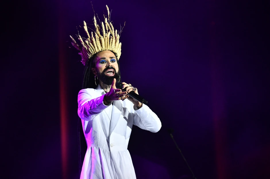Božo se na sceni pojavio u belog haljini do poda, štiklama i kruni na glavi koja je bila sastavljena od šiblja.