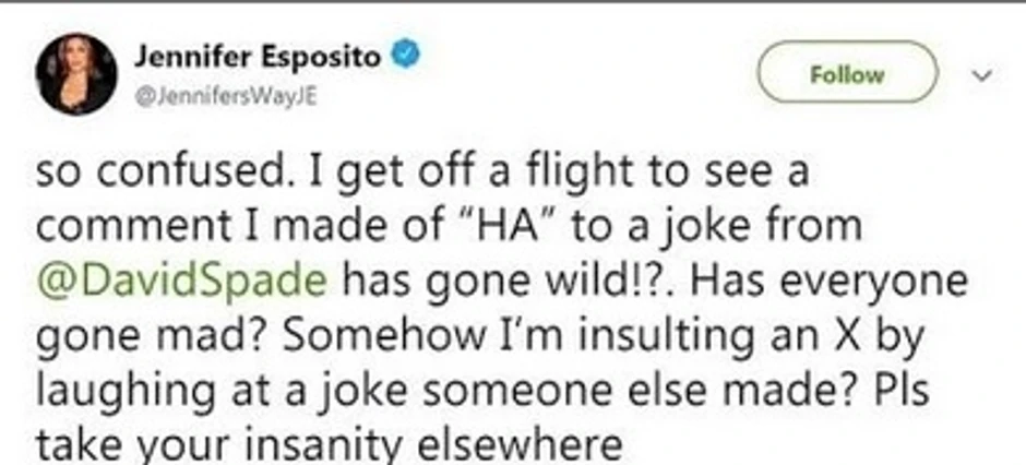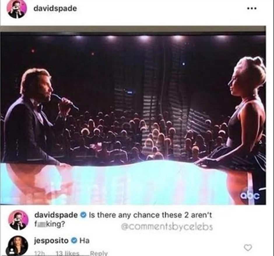 Glumica Dženifer Esposito koja je bila udata za Bredlija Kupera napisala je prvo samo kratko: "Ha" ispod fotografije uz koju stoji komentar: "Postoji li ikakva šansa da se ovo dvoje ne j***?", da bi kada je videla komentare na njenu obajvu napisala i sledeće: