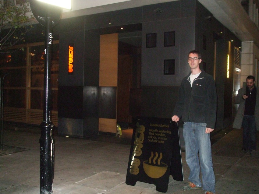 I tako korak po korak, nađosmo se ispred jednog od Đorđevih omiljenih restorana, “Bušaba” u Ulici Kings road. Na ulazu u ovaj tajlandski restoran, dočekuje nas kelner koji nas odvodi do stola i smešta sa grupom nepoznatih ljudi. Đorđe sa osmehom pita: