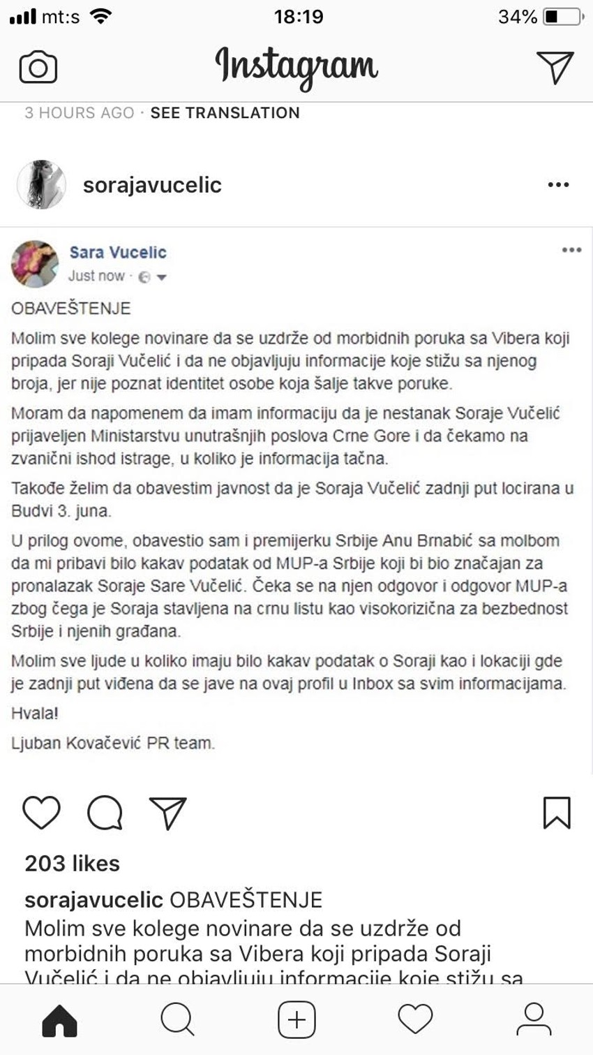 - Moram da napomenem da imam informaciju da je nestanak Soraje Vučelić prijavljen Ministarstvu unutrašnjih poslova Crne Gore i da čekamo zvaničan ishod istrage, ukoliko je informacija tačna - piše na profilima na društvenim mrežama srpske starlete.