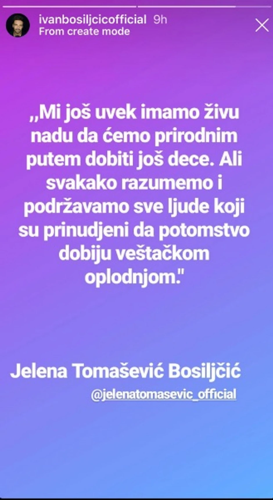 - Mi još imamo živu nadu da ćemo prirodnim putem dobiti još dece. Ali svakako razumemo i podržavamo sve ljude koji su prinuđeni da potomstvo dobiju veštačkom oplodnjom - rekla je Jelena i na taj način poslala snažnu poruku svima koji se na ovaj način bore za potomstvo.