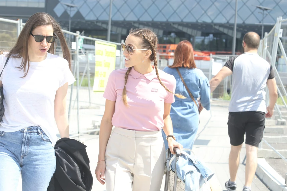Jelena je sve vreme bila nasmejana i raspoložena, na sebi je imala poslovne pantalone i sportsku majicu, upletene dve kike i naočare za sunce, a kofer je vukla sama.