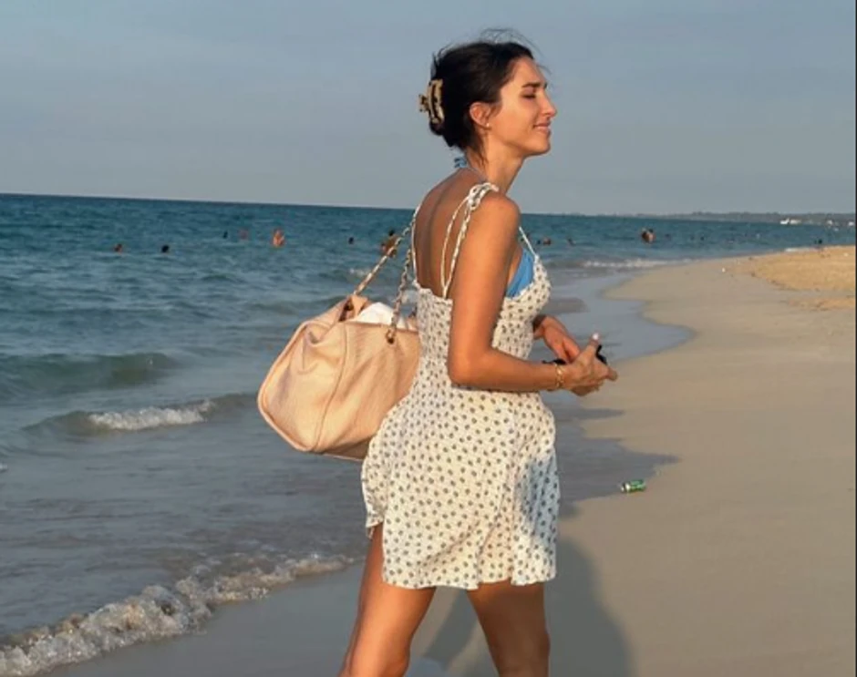 Naime, glumica je prvo objavila fotografiju u lepršavoj haljini dok je bosa šetala plažom, a onda je haljinu skinula i sunčala se u plavom bikiniju.