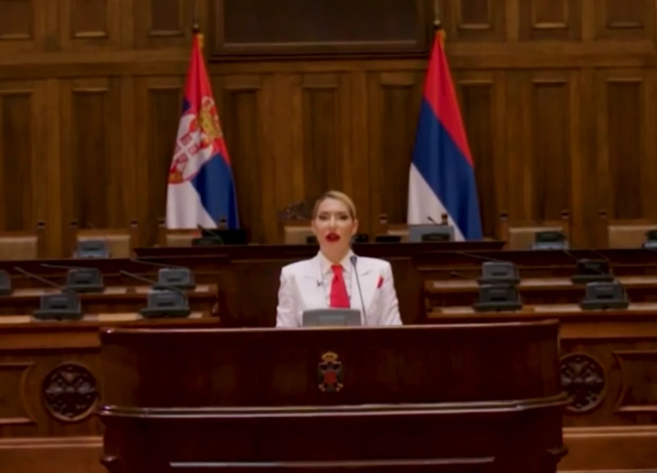 Jovanu Jeremić, naime, u pomenutim kadrovima vidimo kako ulazi u Skupštinu Srbije, te se potom obraća publici poput poslanika.