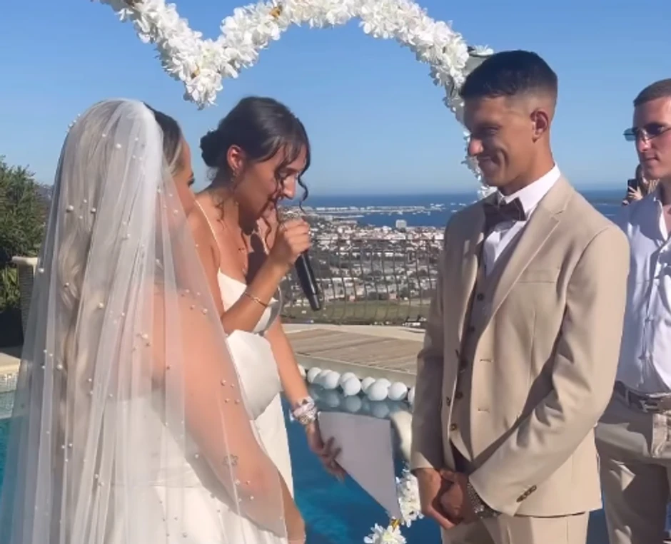 Anđela je zablistala u raskošnoj beloj venčanici, dok je Aleksa nosio kombinaciju belog i bež, savršeno uklopivši se u svečani ton događaja.