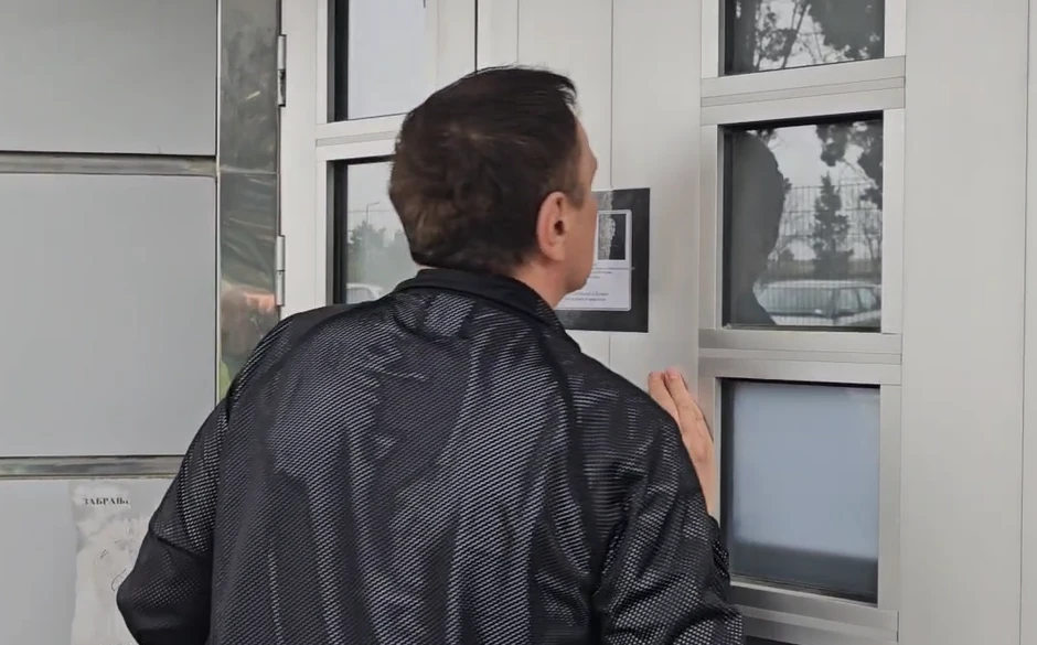 Nakon što se na kratko obratio novinarima, pred ulazak u studio pomazio je, a potom i poljubio umrlicu Saše Popovića, koji stoji na vratima zgrade.