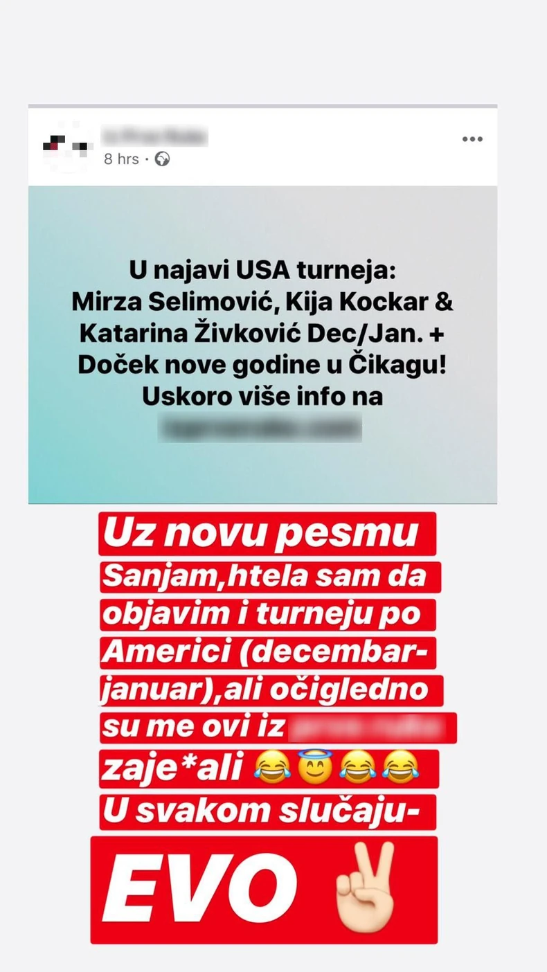 - Uz novu pesmu "Sanjam" htela sam da objavim i turneju po Americi, decembar - januar, ali očigledno su me ovi za*****i. U svakom slučaju, evo! - navela je ona na društvenim mrežama.