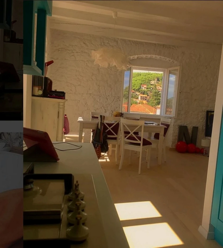 Veliki prozori omogućavaju obilje prirodnog svetla, dok tirkizno plava kuhinja unosi dašak mediteranskog šarma. Enterijer je pažljivo osmišljen kako bi pružio maksimalan komfor tokom letnjih meseci.