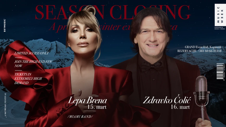 Dve najveće regionalne muzičke senzacije dovešće do usijanja atmosferu na dobro poznatom mestu - u Event Hall-u hotela GRAND Kopaonik, donoseći grandiozno finale najpopularnijeg zimskog muzičkog festivala i premium iskustvo kakvo se ne zaboravlja. Tako će prva dama šoubiznisa, Lepa Brena, svojom harizmom i prepoznatljivim hitovima raspametiti publiku prve večeri, dok će Čola, gospodar emocija i pesama koje su obeležile sve generacije, zatvoriti muzičku sezonu svojim nezaboravnim koncertom narednog dana.