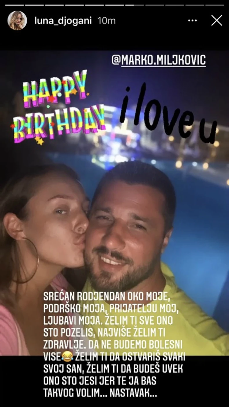 - Srećan rođendan oko moje, podrško moja, prijatelju moj, ljubavi moja. Želim ti sve ono sve što poželiš, najviše ti želim zdravlje i da ne budemo bolesni više. Želim ti da ostvariš svaki svoj san, želim ti da budeš uvek ono što jesi, jer te ja baš takvog volim. Želim ti da budeš dobar vernik, suprug i ako bog da otac. Želim ti da svi tvoji dragi ljudi budu dobro i zdravi, želim ti da budeš srećna kakva god to sreća bila. Volim te, jer si uvek bio tu. Volim te, jer i kad je bilo najgore nisi odustao i ostao si i borio se. Volim te, jer me nikad nisi izdao. Volim te, jer si me učinio najsrećnijom devojkom na svetu i hvala ti. Srećan rođendan okce - napisala je Luna u nekoliko objava.