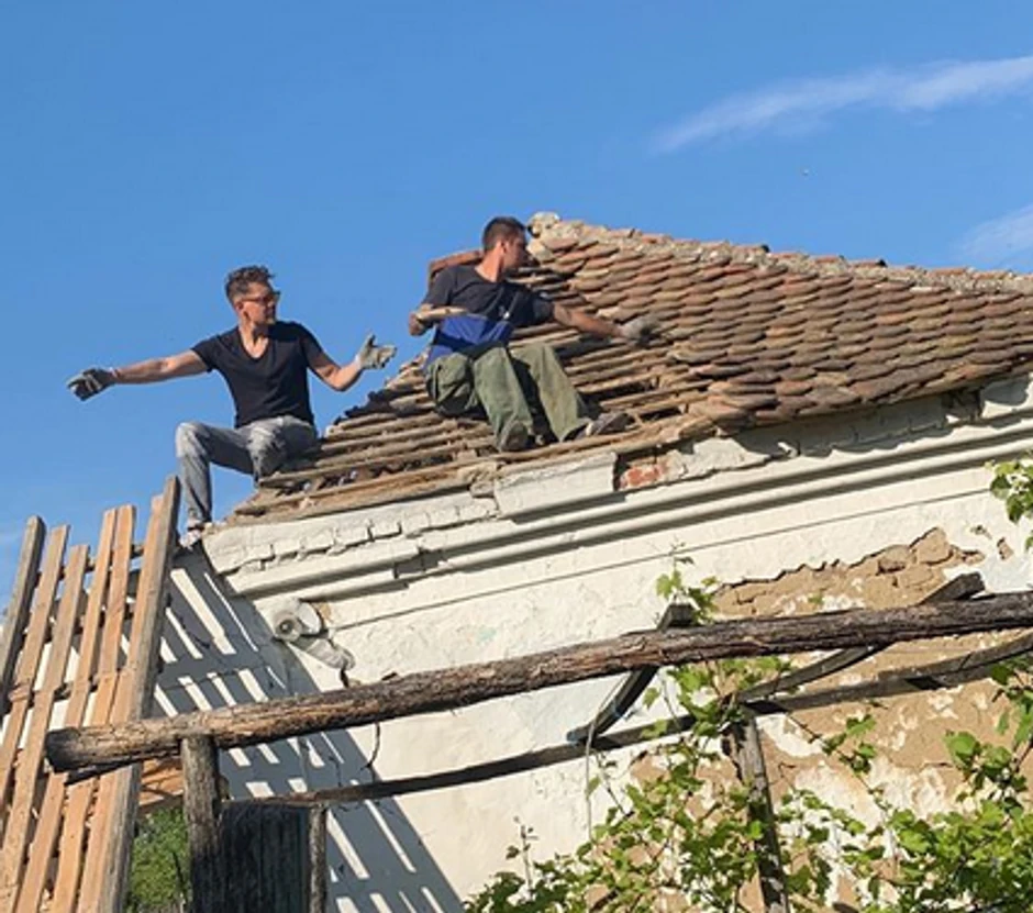 Na trećoj Miloš Biković nalazi se na krovu sa jednim muškarcem i zajedno rade, a deluje da glumcu nije teško palo da se lati posla.