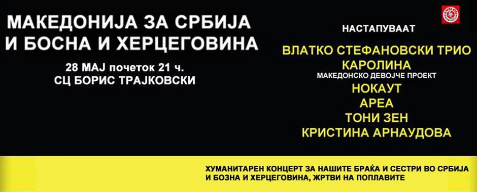 Karolina Gočeva, Vlatko Stefanovski trio, Area, Nokaut, Toni Zen i Kristina Araundova nastupiće 28. maja na humanitarnom koncertu za Srbiju i Bosnu i Hercegovinu koji će se održati u SC Boris Trajkovski u Skoplju.