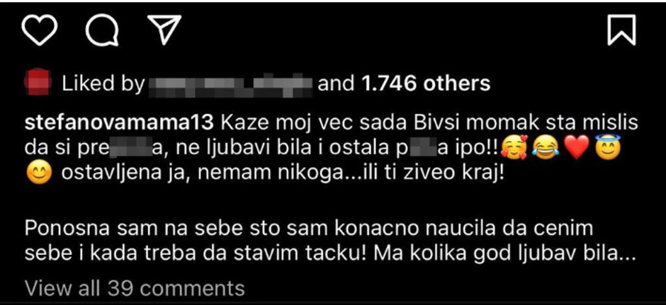 Razlog raskida nije želela da otkrije, ali je u opisu fotografije koju je objavila jasno stavila do znanja da je ovog puta odlučila da ceni sebe ne toleriše poniženja: