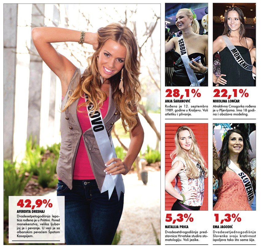 Daleko iza nje ostale su srpska misica Anja Šaranović (28,1 odsto), hrvatska misica Natalija Prica (5,3 odsto), crnogorska misica Nikolina Lončar (22,1 odsto), ali i predstavnica Slovenije - Ema Jagodić (1,3 odsto). Devojke iz Bosne i Hercegovine ne učestvuju u izboru za Mis univerzuma, pa su zato i izostale iz naše ankete.