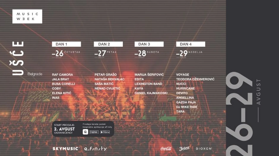 Prodaja ulaznica po promotivnim cenama od 490 RSD za redovne dnevne ulaznice i 890 RSD za fan pit dnevne ulaznice, počinje 2. avgusta tačno u podne. Ulaznice će se moći nabaviti putem besplatne aplikacije eFinity, koja je dostupna za preuzimanje za IOS (https://apps.apple.com/us/app/efinity/id1528523731)i Android (https://play.google.com/store/apps/details?id=biz.simula.infinity&hl=sr&gl=RS).
