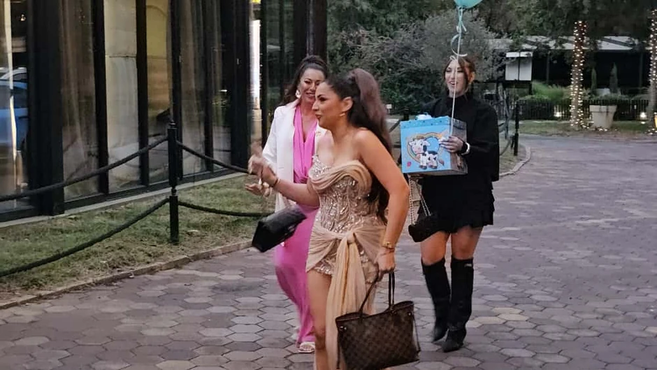 Ponosna mama stigla je u restoran, a za ovu proslavu odabrala je kratku zlatnu haljinu sa plaštom, a za njom je stigao i njen muž milioner iz Nemačke.