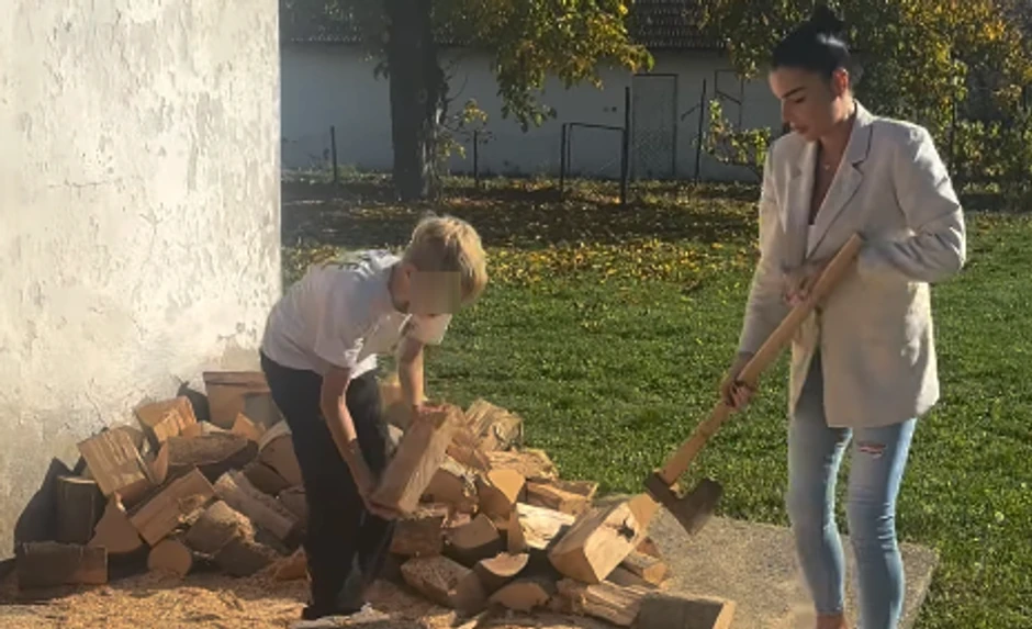 Mia je sa porodicom uživala u lepom danu, a iskoristili su priliku da zajedno spreme ogrev za zimu. Međutim, kada je došao red na nju, ona je u farmerkama i sakou nespretno zamahnula sekirom.