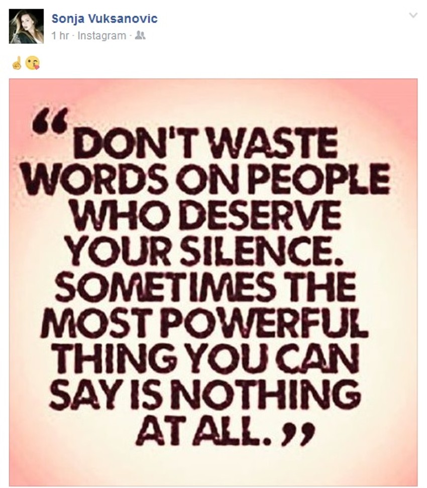 - Ne trošite reči na ljude koji zaslužuju tišinu. Ponekad je najmoćnija stvar koju možete da kažete ta da zapravo ništa ne kažete - napisala je Sonja. Kako izgleda stan u kojem trenutno boravi, pogledajte OVDE. Kako izgleda Acina nova devojka, pogledajte OVDE.