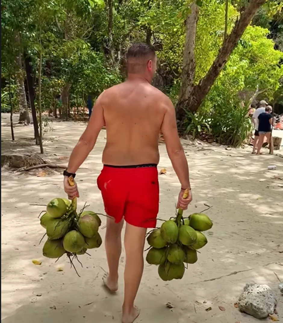 Sve vreme je nosio kokose po plaži, a onda i pokazao da uživa na plaži, kupanju.