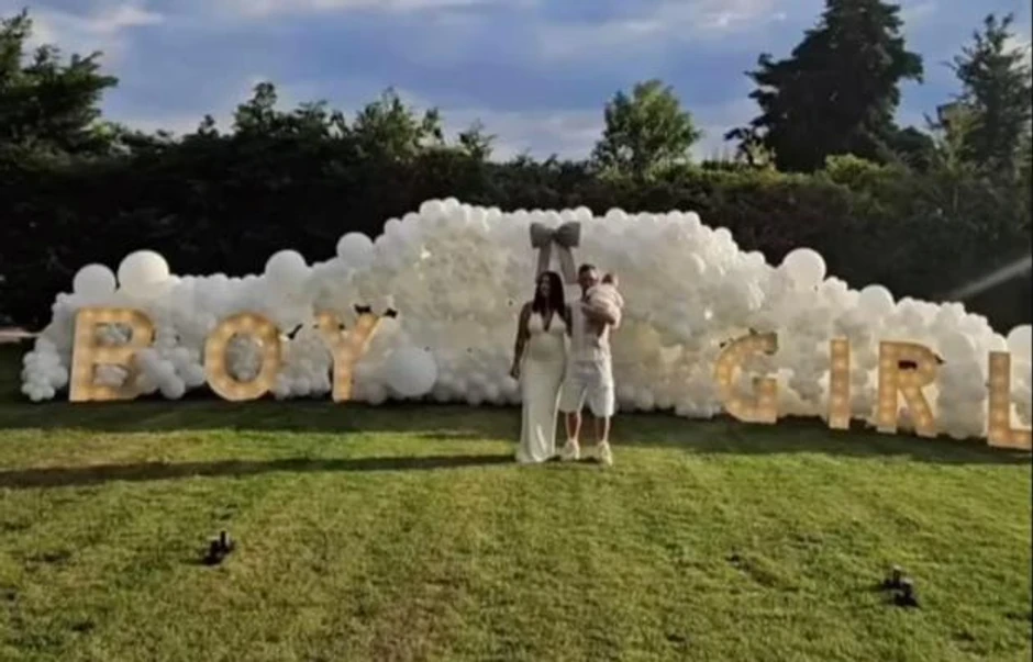 Njih dvoje stajali su ispred zida od belih balona, dok je vatromet u roze boji otkrio da stiže devojčica. Par je bio obučen u elegantne bele kombinacije, a njihov sin, koji je bio u naručju, takođe je bio deo ove svečane atmosfere.