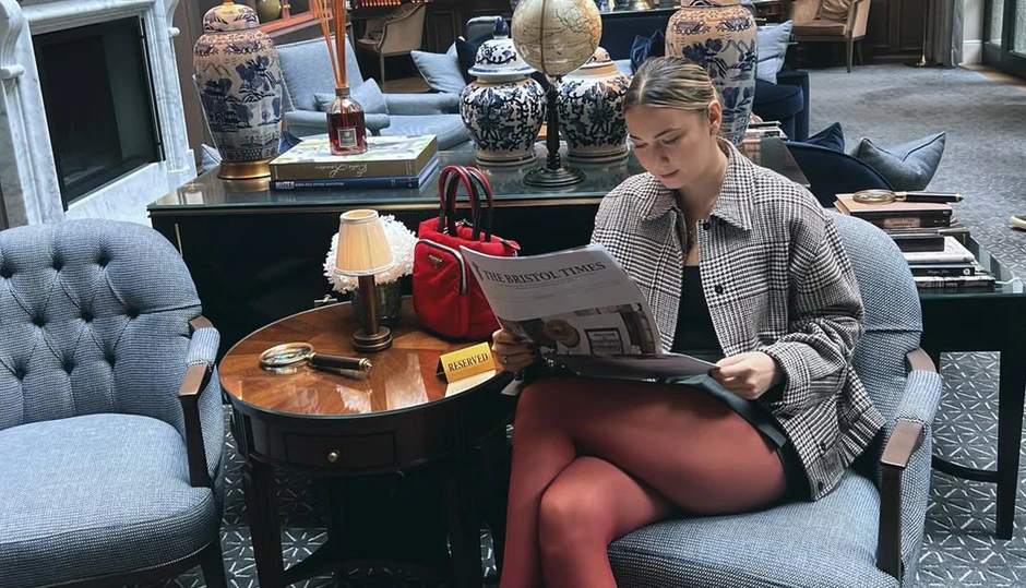 Obukla je kratku suknju sa crvenim čarapama, a celu kombinaciju upotpunila je sivom jaknom.