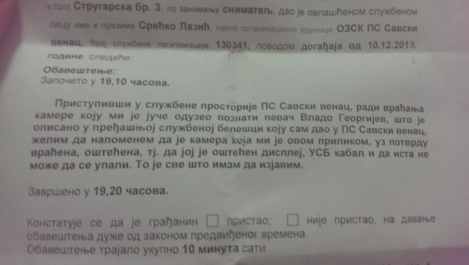 Darko Popović izjavio je da je kamera vraćena ali da je oštećena, kao i da ista ne može da se upali.