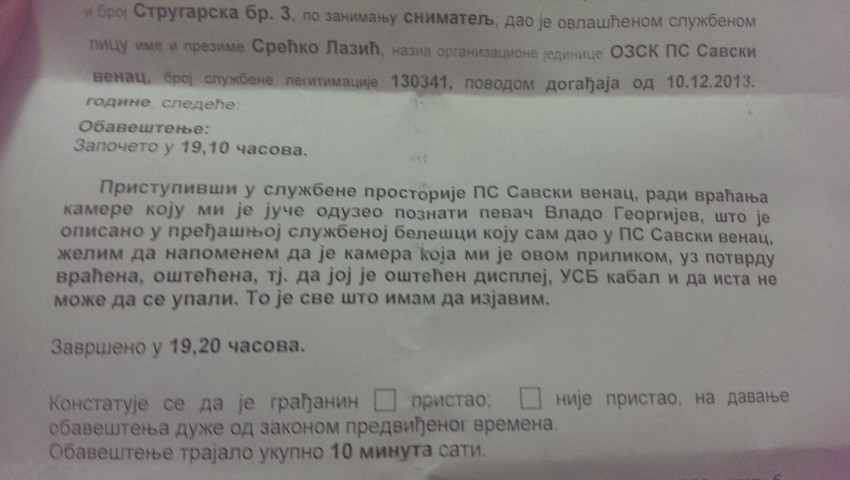 Nakon što je u utorak pevač Vlado Georgiev oduzeo kameru snimatelju emisije "Paparaco lov", obe strane su dale iskaze u policiji. Producent ove emisije tvrdi da pevač laže, kao i da je vratio oštećenu kameru.