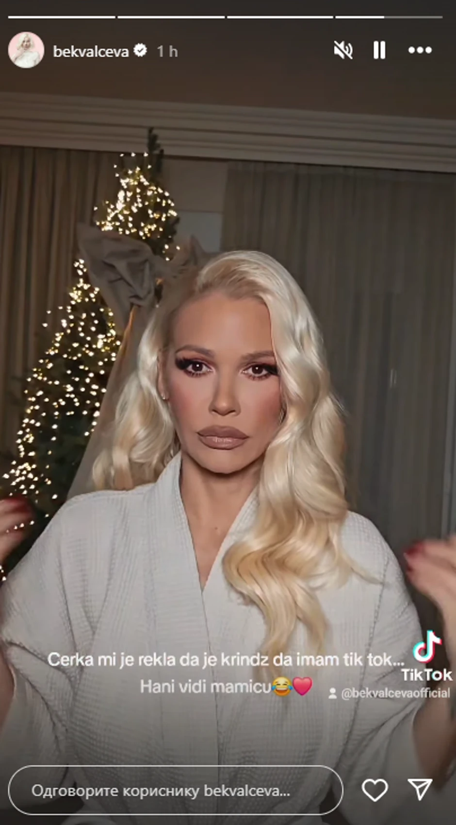 - Ćerka mi je rekla da sam krindž jer imam Tiktok... Hana, vidi mamicu - napisala je pevačica na snimku, na kom se vidi kako blista doterana i u bademantilu.