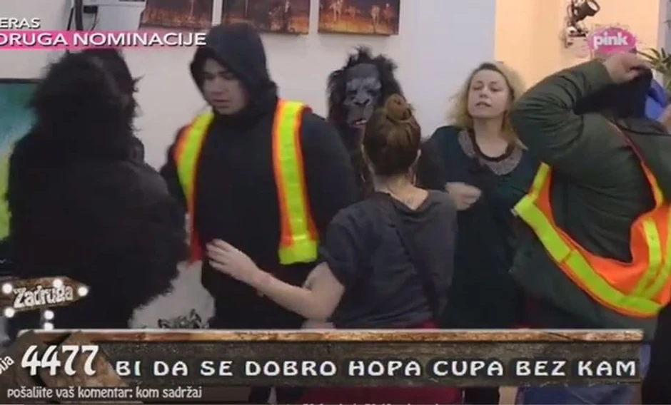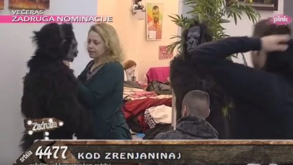 Filip i Bane su u kostimima gorile stajali pored Dragice i šalili se na njen račun, što je nju iznerviralo toliko, da je počela da davi Čolaka.
