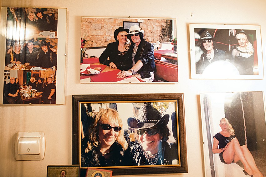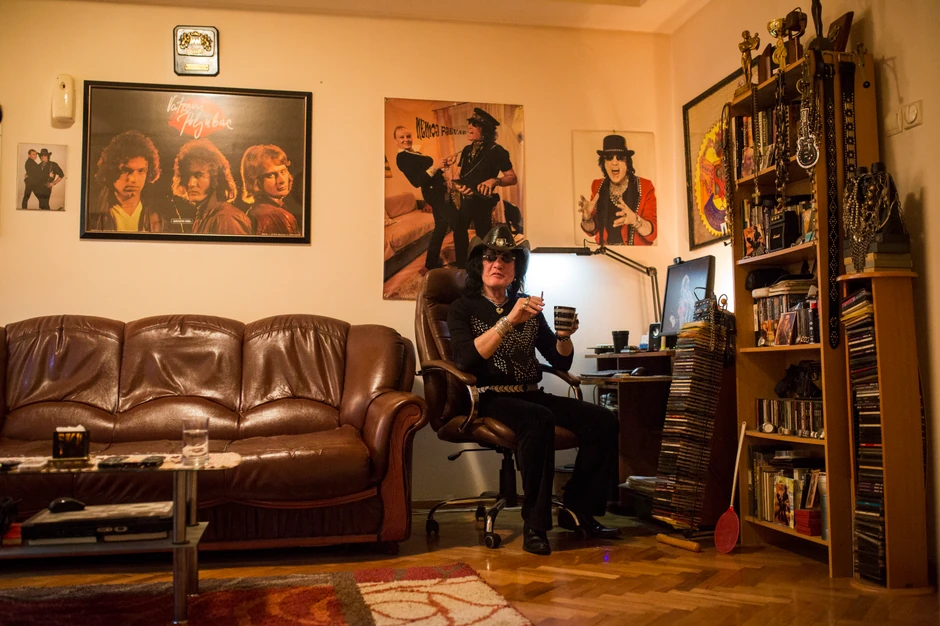 Zatim nas je poveo u dnevni boravak u kome svakodnevno provodi najveći deo vremena i pokazao nam brojne uspomene, rokerske motive, nagrade i fotografije sa suprugom Suzanom.