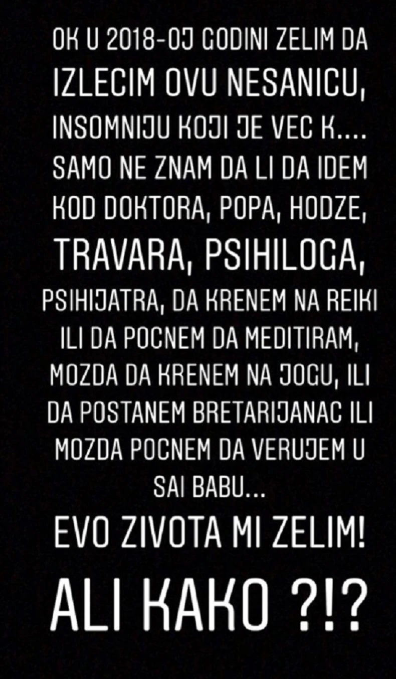 - Okej, u 2018. godini želim da izlečim ovu nesanicu, insomniju, koji je već k... Samo ne znam da li da idem kod doktora, popa, hodže, travara, psihologa, psihijatra... - napisala je, između ostalog, članica žirija "Zvezda Granda", da bi potom potražila pomoć od obožavatelja. Pre izvesnog vremena, posetili smo Mariju Šerifović i u njenom stanu, a kako on izgleda, saznajte OVDE.