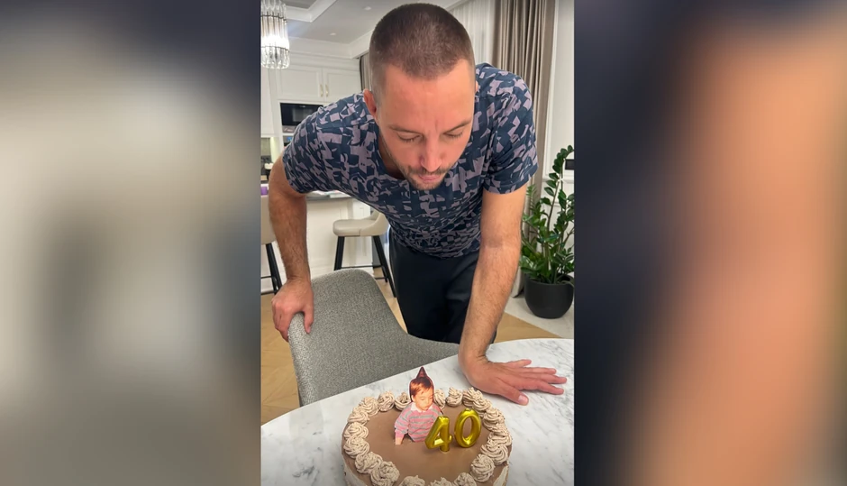 Viktor je dobio čokoladnu tortu u obliku srca, a pored svećica sa zlatnim brojem 40, na torti je bila figura Viktora iz detinjstva kada je kao dečak duvao svećice na torti.