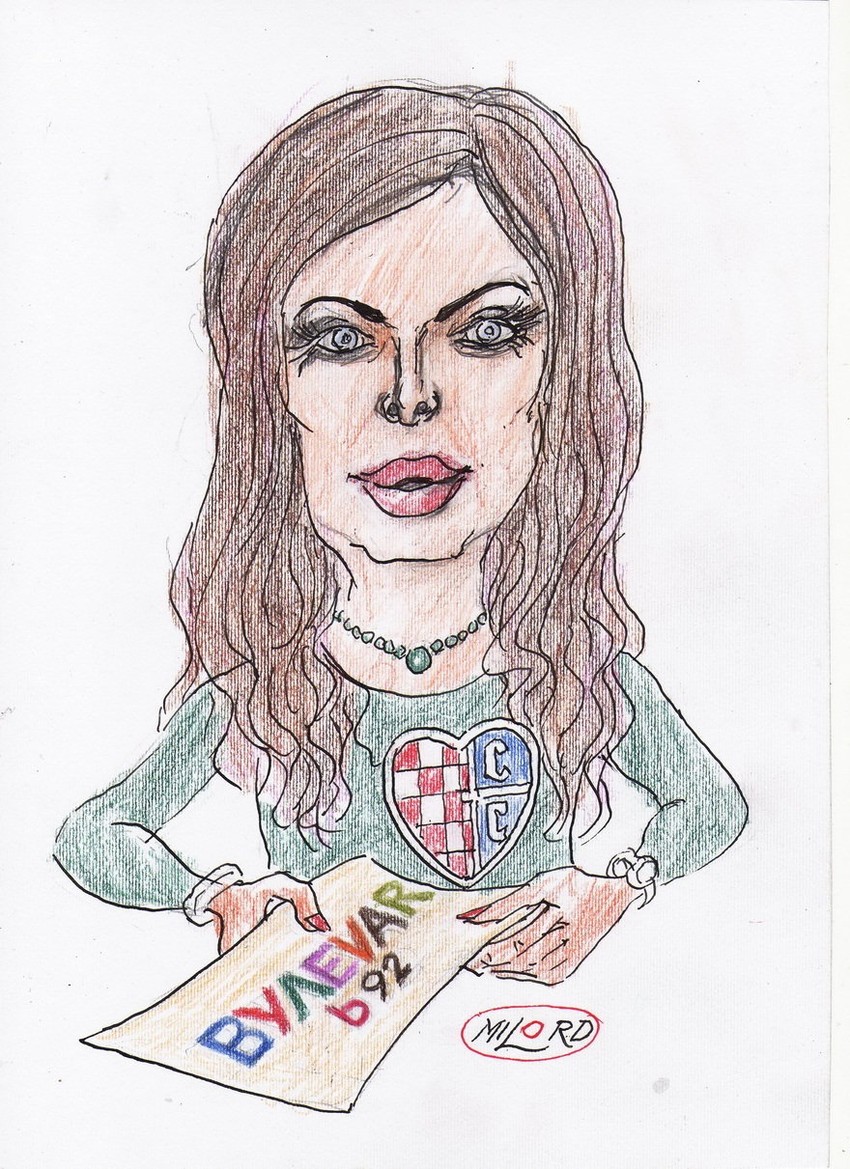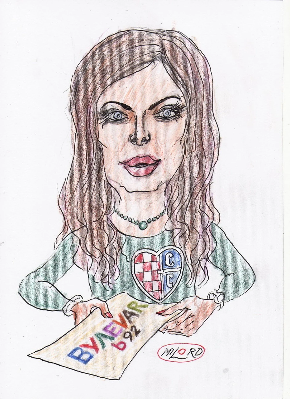 3. Svakako privilegijom. Inače, Vladimiru je karikaturista dao nešto od Duška Vujoševića, pitam se zašto? U svakom slučaju, izgleda stariji nego što Vlado zaista jeste. On je mlad u srcu. Sviđa mi se amblem koji Nikolina ima na grudima. U kombinaciji s očima vračare, ukazuje na svu neobičnost, da ne kažem šizoidnost njenog profesionalnog položaja. Nevena i liči i ne liči na sebe, ali jedno je pogodio - Nevena je Holivud! Kako je to neobično.