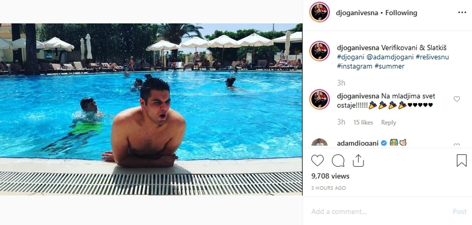Dok su se odmarali na bazenu, Adam je odlučio da se našali sa strinom Vesnom, s obzirom na to da je nedavno dobio verifikovan nalog na Instragramu, dok pevačicin profil još nema ovu oznaku.